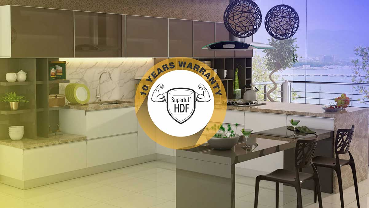 We offer carcase in Supertuff HMR HDF, that is edge banded with PUR. The Supertuff* HDF, an introduction from Spacewood has high water resistivity, high density of 800kg/m3 (higher than plywood), high screw holding properties and termite resistance due to melamine lamination. The entire carcass in Supertuff HDF is then pressed on a high frequency with high-quality strong glues that allow perfect alignment and makes the joints strong and permanent. Thus, we are committed to a 10 yr warranty.